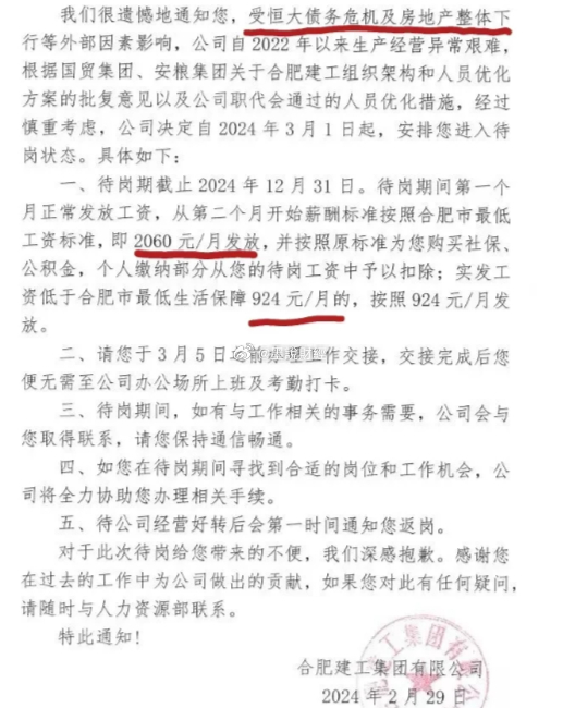 【有多少像合肥建工这样的企业,被恒大拖累了?】合肥建工曾经是优秀的地方国企,自2022年开始,运营就异常艰难,坚持到现在已经实属不易,如今大批员工不得不待岗。每月只发最低工资2060元,扣掉五险一金后,有些员工甚至只能拿到手924元,这跟过去效益好的时候要差10多倍了。